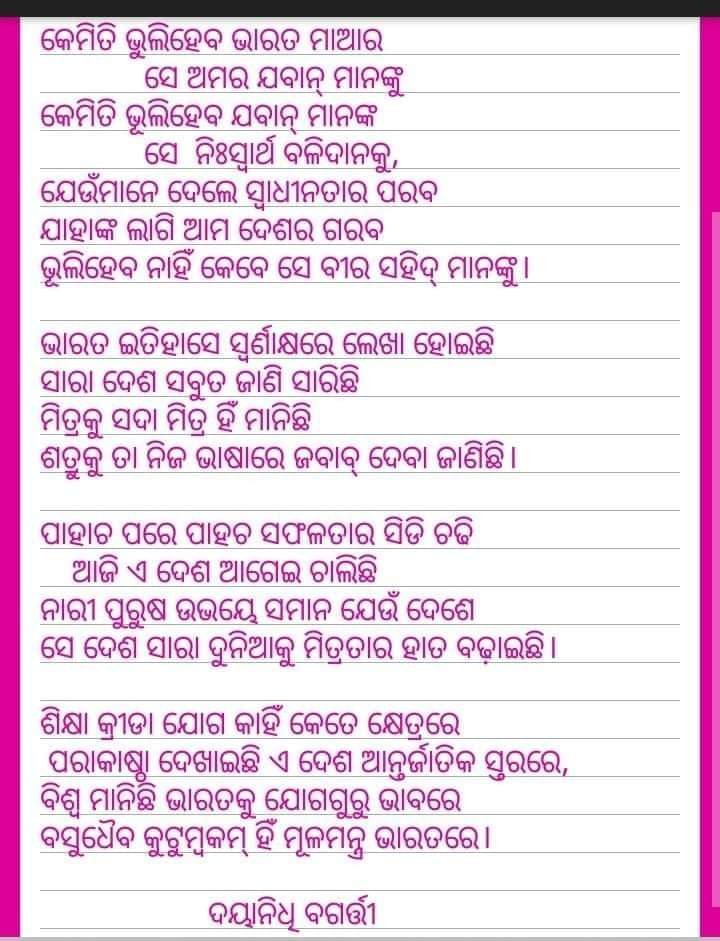 Swadhinatara Parba Posted byDayanidhi BagarteeAugust 17, 2020August 17, 2020Posted inUncategorizedTags:celebration, Independence, song Share this: Click to share on X (Opens in new window) X Click to share on Facebook (Opens in new window) Facebook Like Loading... Related Published by Dayanidhi Bagartee I am Dayanidhi Bagartee.I am a Botany lecturer.I also write poems and lyrics. View more posts